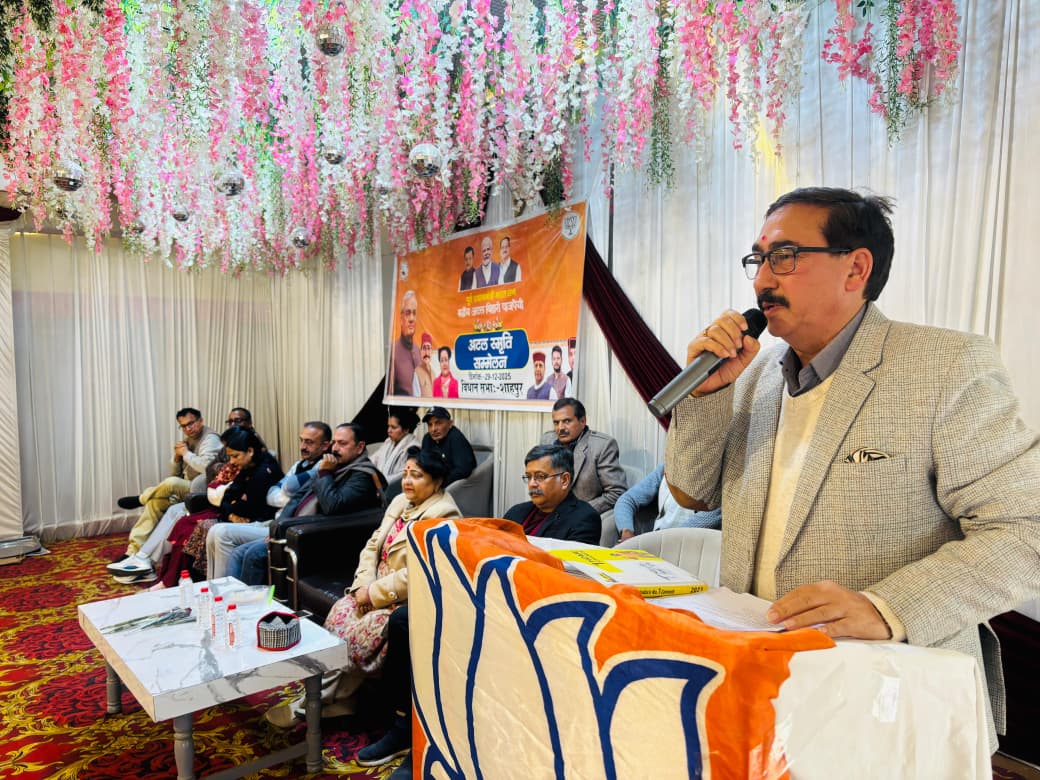 सिद्धिविनायक टाइम्स शिमला। धर्मशाला/शाहपुर, 29 दिसम्बर 2025 — भारतीय जनता पार्टी ने भारत रत्न व पूर्व प्रधानमंत्री स्वर्गीय अटल बिहारी वाजपेयी की स्मृति में जिला कांगड़ा के शाहपुर स्थित अभिनंदन पैलेस में अटल स्मृति सम्मेलन का आयोजन किया। कार्यक्रम की शुरुआत अटल बिहारी वाजपेयी के चित्र पर पुष्पांजलि अर्पित कर की गई। सम्मेलन में मुख्य वक्ता हिमाचल प्रदेश विधानसभा के पूर्व अध्यक्ष एवं पूर्व मंत्री विपिन सिंह परमार रहे, जबकि पूर्व मंत्री सरवीन चौधरी, जिला अध्यक्ष सचिन शर्मा सहित पार्टी के वरिष्ठ पदाधिकारी और बड़ी संख्या में कार्यकर्ता उपस्थित रहे। अपने संबोधन में विपिन सिंह परमार ने कहा कि अटल बिहारी वाजपेयी केवल एक राजनीतिक व्यक्तित्व नहीं, बल्कि राष्ट्रनिर्माण की सोच और मूल्यों के प्रतीक थे, जिनकी दूरदर्शिता और सुशासन की नीति ने भारतीय राजनीति को नई दिशा दी। उन्होंने पोखरण परमाणु परीक्षण, प्रधानमंत्री ग्राम सड़क योजना, स्वर्णिम चतुर्भुज परियोजना, सर्व शिक्षा अभियान, टेलीकॉम क्रांति और लाहौर बस यात्रा जैसे ऐतिहासिक निर्णयों का उल्लेख करते हुए कहा कि इन पहलों ने देश की सुरक्षा, विकास और वैश्विक प्रतिष्ठा को मजबूत किया।