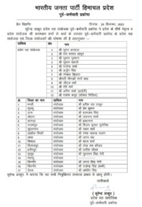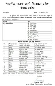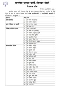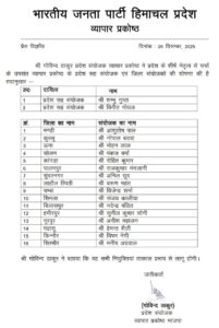 शिमला: भारतीय जनता पार्टी हिमाचल प्रदेश ने संगठन को मजबूत और सक्रिय बनाने की दिशा में बड़ा कदम उठाते हुए विभिन्न प्रकोष्ठों में प्रदेश और जिला स्तर पर पदाधिकारियों की नियुक्तियों की घोषणा की है। ये नियुक्तियाँ प्रदेश नेतृत्व से विचार-विमर्श के बाद की गई हैं और तत्काल प्रभाव से लागू होंगी।