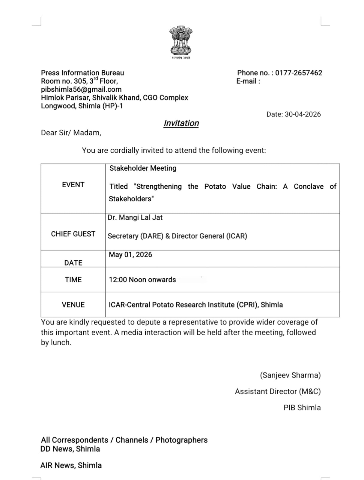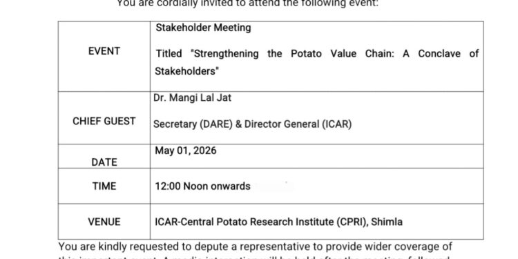 शिमला स्थित केंद्रीय आलू अनुसंधान संस्थान (CPRI) में कल, 1 मई 2026 को “पोटैटो वैल्यू चेन को मजबूत करना” विषय पर एक भव्य स्टेकहोल्डर्स सम्मेलन का आयोजन किया जा रहा है। दोपहर 12 बजे शुरू होने वाले इस कार्यक्रम में कृषि अनुसंधान एवं शिक्षा विभाग (DARE) के सचिव और भारतीय कृषि अनुसंधान परिषद (ICAR) के महानिदेशक डॉ. मांगी लाल जाट मुख्य अतिथि के रूप में शिरकत करेंगे। इस सम्मेलन का मुख्य उद्देश्य आलू की खेती से जुड़े हर पक्ष, जिसमें किसान, वैज्ञानिक, उद्योगपति और नीति निर्माता शामिल हैं, को एक मंच पर लाना है ताकि आलू सेक्टर के विकास के लिए सामूहिक रणनीति तैयार की जा सके। यह आयोजन न केवल ज्ञान के आदान-प्रदान का माध्यम बनेगा बल्कि आलू उद्योग की चुनौतियों को सुलझाने और वैल्यू चेन को बेहतर बनाने की दिशा में भी एक बड़ा कदम साबित होगा।