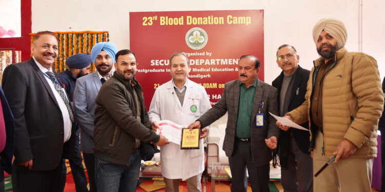 Sidhivinayak taimes Shimla। PGIMER, Chandigarh marked the eve of Netaji Subhash Chandra Bose Jayanti with a profound gesture of national service by organising its 23rd Mega Blood Donation Camp on 21 January 2026 at Zakir Hall, PGI. Organised by the Security Wing of PGIMER under the leadership of Prof. Vivek Lal, Director, PGIMER, the camp reflected the institute’s commitment to patriotism, sacrifice and humanitarian service. The event was inaugurated by Prof. Radha Kant Ratho, Dean (Academics), and Prof. Ashok Kumar, Medical Superintendent, PGIMER, and was conducted by the expert team of the Department of Transfusion Medicine. Senior officials of PGIMER and dignitaries from U.T. Chandigarh attended the programme and lauded the Security Wing for transforming the occasion into a meaningful service-driven tribute to Netaji. Addressing the gathering, Prof. Radha Kant Ratho emphasised that voluntary blood donation is among the highest forms of service to the nation and stated that observing Netaji Jayanti through such an initiative reinforces the values of collective responsibility and compassion. Prof. Ashok Kumar echoed these sentiments, noting that commemorating Netaji Subhash Chandra Bose through life-saving acts such as blood donation truly reflects his ideals of courage, discipline and selflessness.