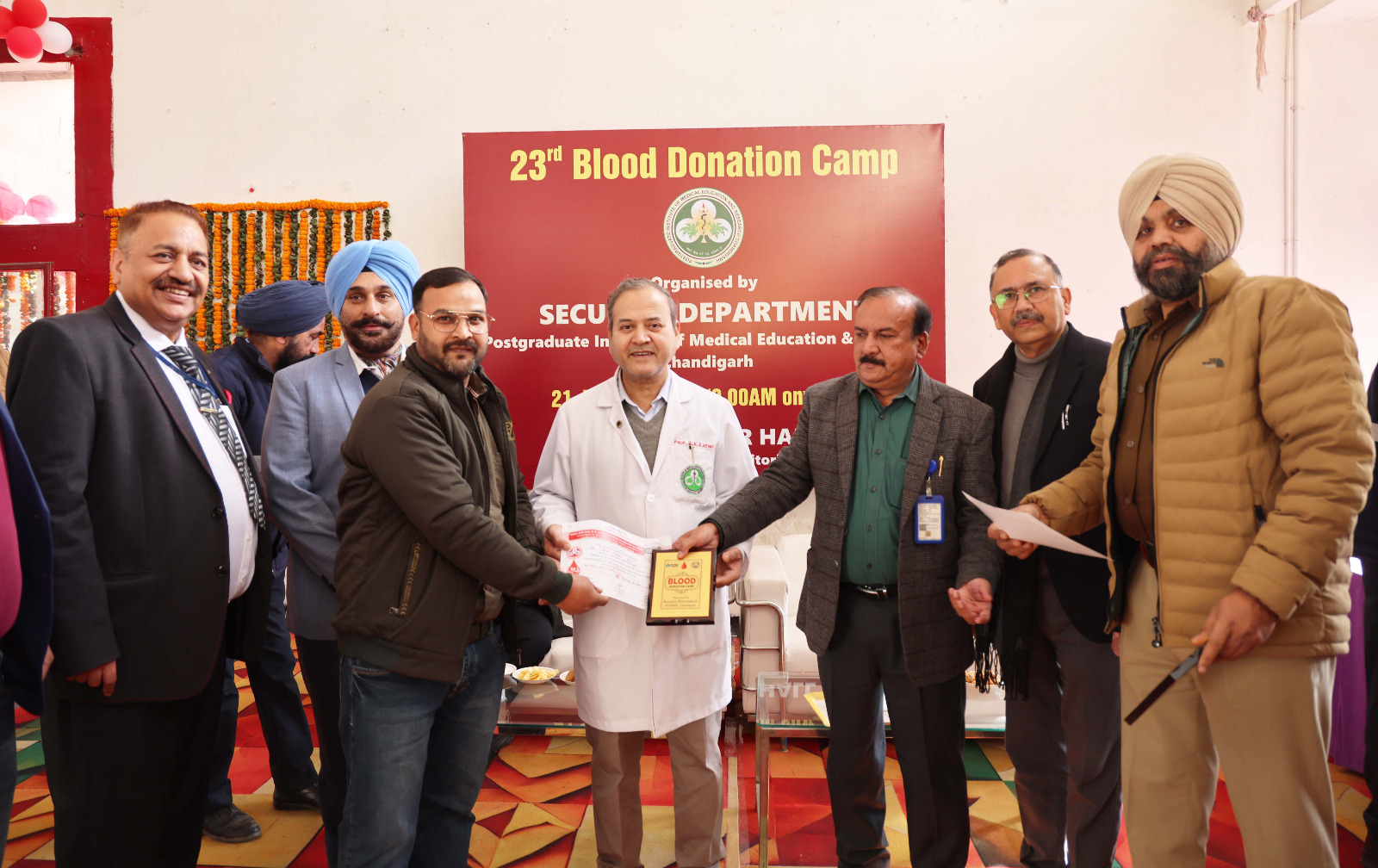 The camp was organised under the administrative stewardship of Prof. Vipin Koushal, Medical Superintendent, PGIMER, with key coordination support from Dr. Rajeev Chauhan, Department of Anaesthesia and Intensive Care, ensuring smooth inter-departmental collaboration. Held under the supervision of Sh. Gursharan Singh Korey, Chief Security Officer, PGI, the camp witnessed an enthusiastic response, with 510 volunteers from diverse backgrounds—including doctors, nurses, students, technicians, security staff and personnel from CRPF and CISF—donating blood. Several others were deferred due to medical or time-related constraints. In a significant addition, 37 participants pledged for organ donation and were registered with ROTTO, PGIMER, highlighting the institute’s sustained advocacy for organ and tissue donation. Senior officers of PGIMER and security forces led from the front by donating blood, inspiring others to participate. Donors were felicitated with refreshments, meals and mementos sponsored by various supporting organisations, reinforcing the spirit of appreciation for voluntary service.