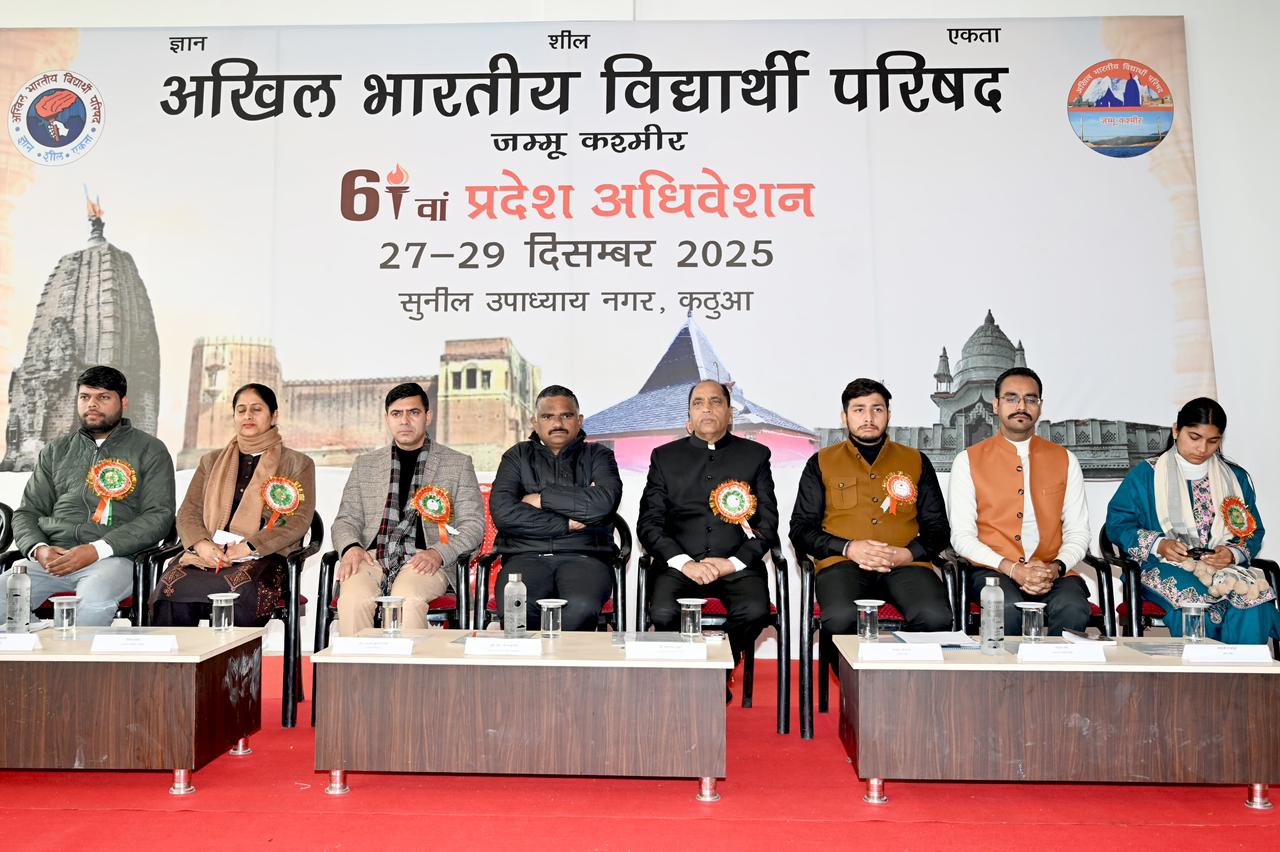 जयराम ठाकुर ने कहा कि जम्मू-कश्मीर प्रांत अधिवेशन में सहभागिता उनके लिए गौरव का विषय है। यह आयोजन राष्ट्र निर्माण में युवाओं की भूमिका को मजबूत करने का प्रभावी मंच बनकर उभरा है। उन्होंने अपने छात्र जीवन को स्मरण करते हुए कहा कि विद्यार्थी परिषद के साथ जम्मू-कश्मीर में कार्य करने का अवसर मिला, जिससे यह प्रदेश उनकी कर्मभूमि भी रहा है।