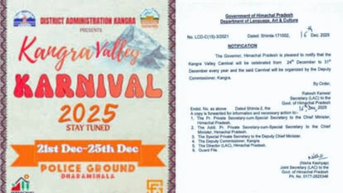 धर्मशाला में आयोजित होने वाले कांगड़ा वैली कार्निवल को अब हिमाचल प्रदेश सरकार की आधिकारिक मंज़ूरी मिल गई है। इसके साथ ही यह महोत्सव अब हर वर्ष नियमित रूप से आयोजित किया जाएगा। सरकार की अधिसूचना जारी होने के बाद यह कार्निवल 24 दिसंबर से 31 दिसंबर तक धर्मशाला के पुलिस मैदान में आयोजित होगा।