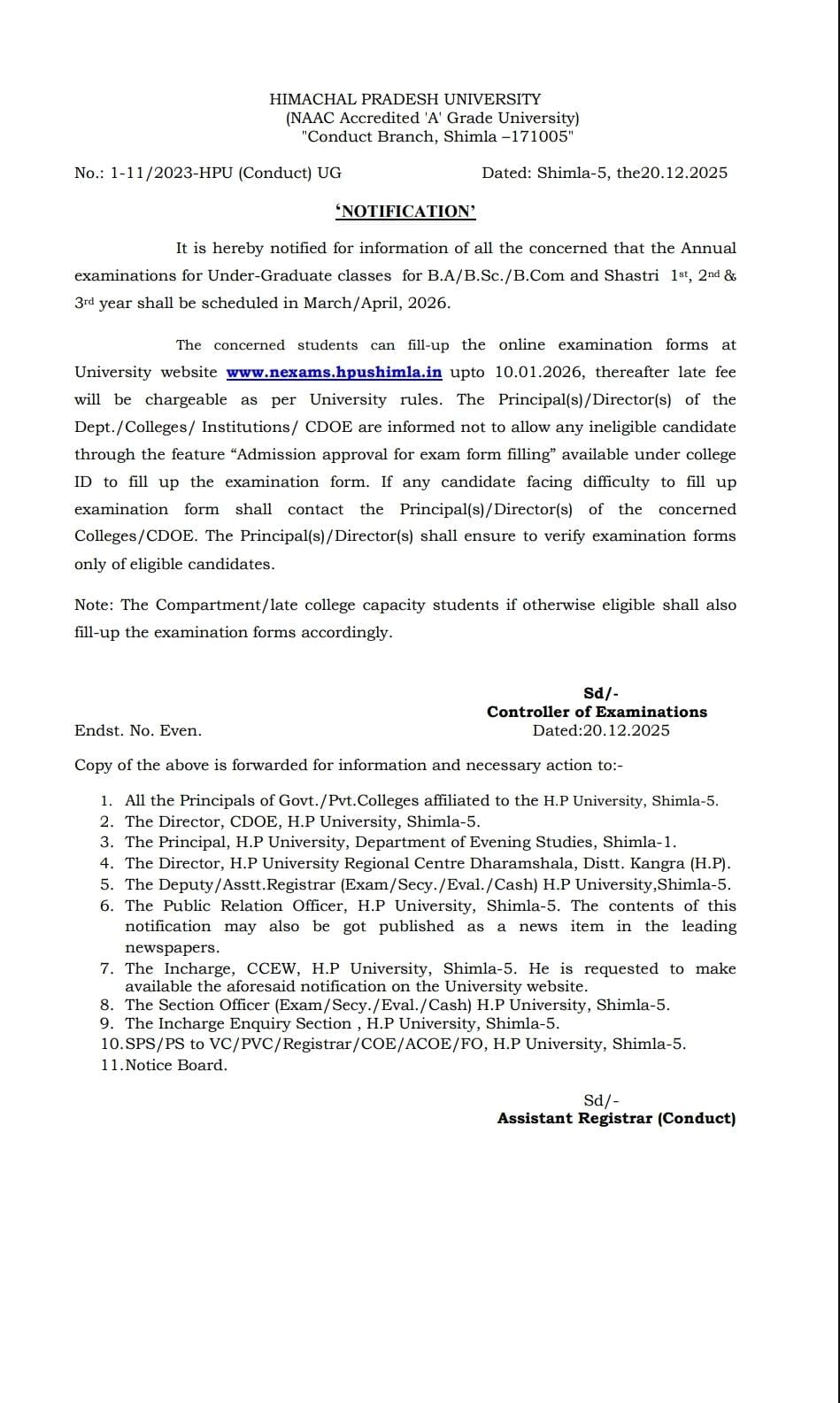 सिद्धिविनायक टाइम्स शिमला। यूनिवर्सिटी प्रशासन द्वारा परीक्षा से संबंधित आधिकारिक अधिसूचना जारी कर दी गई है। इसके अनुसार प्रथम वर्ष, द्वितीय वर्ष एवं तृतीय वर्ष के सभी छात्रों को अपनी परीक्षा का फॉर्म **10 जनवरी 2026** तक अनिवार्य रूप से भरना होगा।